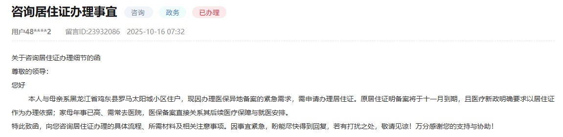 人民网哈尔滨11月9日电(记者王思迪)户籍业务与民生密切相关。近日,黑龙江网友通过人民网“领导留言板”咨询办理居住证、户口迁移等问题。相关部门积极响应,用专业服务解决“急、难、急的情况”。每日在线“排行榜”上网友留言截图。 “由于急需到外地办理医疗保险,需要办理居住证。原居住证登记11月份就到期了,新医保政策明确要求有居住证才有办理依据。”近日,有网友通过人民网“留言板”询问具体流程、所需材料及相关注意事项。他们说母亲年事已高她经常去医院,医保登记直接关系到她后续的医疗保障和就医安排。鸡西市信访局通过人民网“领导板”回应截图。针对该网友反映的问题,鸡西市信访局回应称,鸡东县公安局东风派出所已向该网友谈话。办理居住证须携带身份证及能证明当地居住地的材料(如家庭照片、房屋租赁协议等)到居住地所在地的派出所办理。申请将于提交材料之日起14个日历日内完成。网友们对这些消息的处理表示满意。随后,该网友通过人民网“领导致辞”,详细描述了证件申请流程:“申请的经验办理居住证让我真切地感受到了政府服务的热情和高效,也被陪同民警的年轻女子的专业精神所折服。整个居留许可申请流程都整理好了,但所需物品清单也逐项明确。以下是提交材料的说明。 除了文书处理之外,户籍问题也是与人们生活息息相关的经济领域的问题。有网友留言询问:“我是讷河市农村的一名农民工,孩子的母亲是天津人,孩子出生后,考虑到孩子以后的教育问题,所以把户口定在了天津。现在我想带着孩子搬回老家?”讷河市公安局通过人民“留言板领导”日报在线回复并截图。该网友咨询该问题后发现,该网友户口所在地为空果乡。户口迁移的相关材料已知,可以代为保管。网友们对这些消息的处理表示满意。该网友对留言处理表示满意,并称赞工作人员的热情、热情和专业。