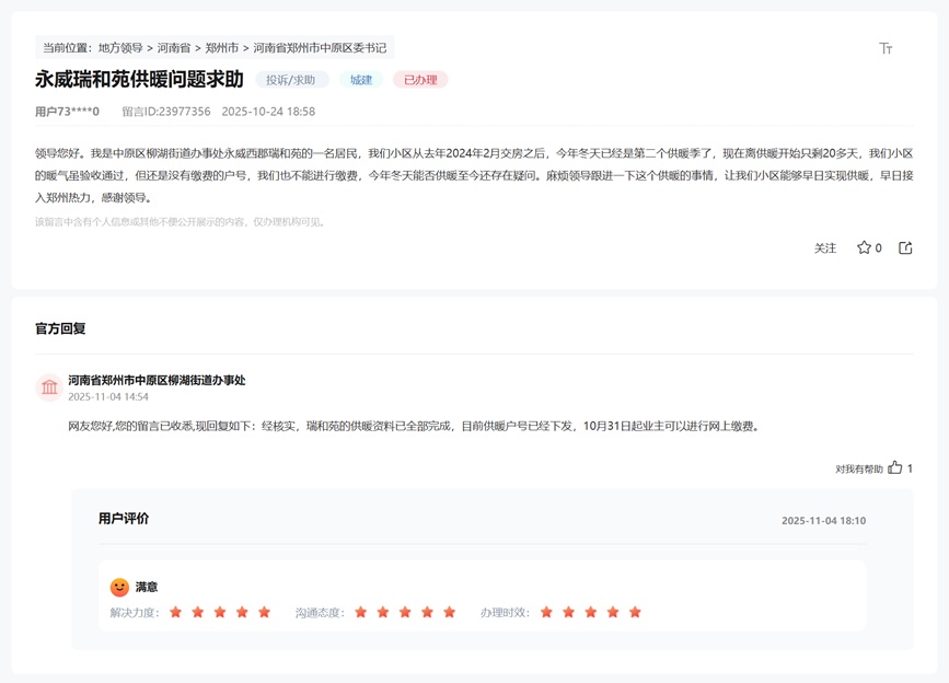入冬后,寒冷加剧,人们取暖、供气、出行安全等经济保障需求更加迫切。近日,河南多地群众通过“人民网领导留言板”反映“没有户号就无法支付取暖费”、“没有天然气就无法使用热水”、“浇水频繁路面湿滑不安全”等问题。当地相关部门接到诉求后,及时回应群众关切,积极处置,确保群众业主的经济保障能够安心过冬。 “距离供暖还有20多天,我们小区供暖户号还没有收到,这时候可以供暖吗?”近日,郑州市中原区流湖街道办事处永维西县瑞和园的居民充满了焦虑。这社区将于2024年2月交房,今年即将迎来第二个供暖季。社区供暖虽然已通过验收,但缴费账号尚未开具,导致业主难以完成缴费,供暖事宜悬而未决。群众诉求通过消息渠道反映后,中原区流湖街道办事处立即介入核实。所有相关供暖信息均已确认,帕瑞和源村已经测试完毕并正式发布分户供暖。目前,业主可以通过线上渠道完成支付,解决了居民“冬天没暖气”的担忧。多方共同努力打破僵局,找到家庭燃气问题的解决方案。 “我来了大概一个月了,房产相关的账单已经全部付清,但一直没能用上天然气。”近日,商丘市泉泉县一名市民通过留言板求助。 “天气越来越冷,缺少天然气和热水,对于80多岁的父母来说非常困难,希望有关部门尽快解决。” 【相关消息】民权县政府接到消息后,迅速责令民权县开发投资有限公司立案调查。回应称,经过民权县住房和城乡建设局、开发投资有限公司和燃气公司沟通讨论,最终达成一致解决方案。业主完成房屋装修后,可以先到社区物业服务中心领取燃气启用通知书,然后持通知书到燃气公司办理登记和开户手续,这样就可以正确启用天然气,满足自己的日常需要。科学的优化浇水操作,兼顾环保和出行安全。 “最近雨下得很大,天气变冷了,洒水车每天都在喷水,路面湿滑,很难开车!”长垣市一位市民反映,近期洒水车频繁操作,导致路面长期处于潮湿状态,尤其是雨天浇水和早晚高峰时段浇水,给市民带来了诸多不便。 【相关消息】接到群众诉求后,长垣市委立即责令市城管局处理并回应。回应解释了浇水作业的初衷,并针对市民关心的问题明确了多项优化调整措施:随着冬季的到来,浇水作业的频率严格根据气温变化进行。根据路面情况和实际情况,合理减少洒水作业频率,优先保障市民出行安全。同时,灵活调整运营时间,避开早晚通勤高峰时段的交通,减少对市民出行的干扰;要求洒水车驾驶员操作时提高警惕,主动避让行人和过往车辆,并根据路段车流量和路况调节洒水水压,避免路面积水过多;另外,对人工作业进行调整,清除作业后路面上的积水或自然形成的积水,及时进行清洁,以加速清除积水,保证路面干燥。在控制扬尘的同时,全力保障市民出行安全舒适。广大群众的利益这不是小事。你需要解决哪些困难?欢迎您在人民网“领导留言板”留言,分享您的奋斗和担忧。